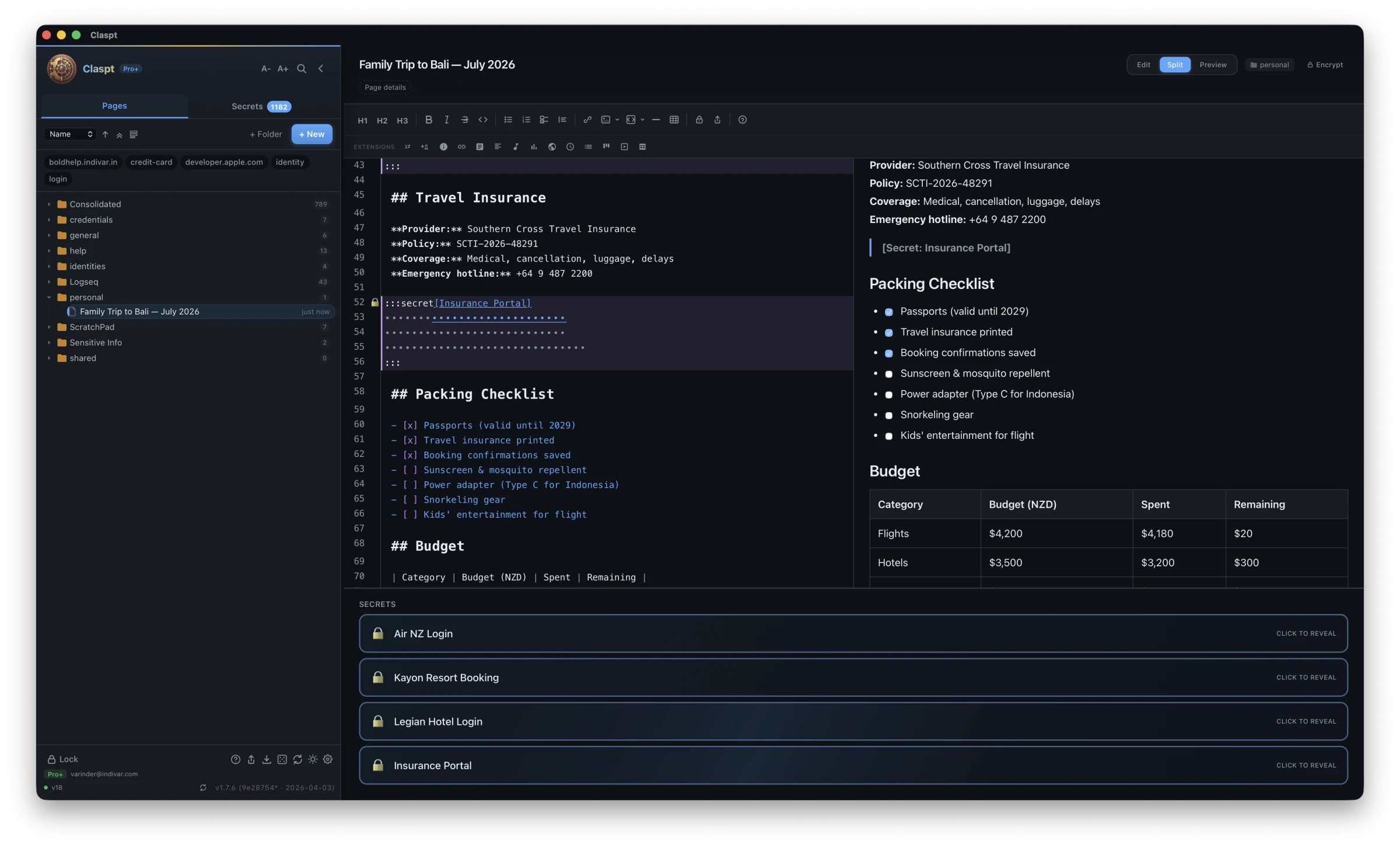 Claspt is a cross-platform encrypted personal vault that combines markdown note-taking with AES-256-GCM encrypted secret storage. Your notes live in portable .md files. Your passwords, API keys, credit cards, and anything else sensitive live inside those notes as inline :::secret[Label] blocks that get encrypted on save and decrypted only when you reveal them. Nothing on disk is ever plaintext. No cloud lock-in, no proprietary format — you can open a Claspt vault in any text editor and still read the prose around your secrets.