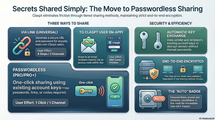 When you share passwordlessly, the Claspt relay handles a key exchange between your account and the recipient's account. The secret is encrypted in a way that only the recipient's existing keys can decrypt. No new password is generated, no code is emailed, and the relay server never sees the plaintext content. The recipient simply opens Claspt and imports the share — their app already has the keys it needs.